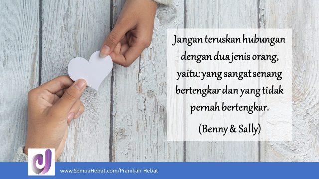 Home Kutipan Pranikah K-Pra Hubungan Jangan teruskan hubungan dengan dua jenis orang, yaitu: yang sangat senang bertengkar... Kutipan PranikahK-Pra HubunganKutipan PersonalKutipan HubunganPranikah Jangan teruskan hubungan dengan dua jenis orang, yaitu: yang sangat senang bertengkar dan yang tidak pernah bertengkar. (Benny & Sally) By Tim Pranikah Hebat - December 11, 2020 326 0 SHARE Facebook Twitter